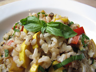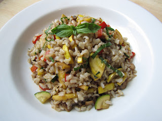 That's why I decided to change up the oh-so-common Asian stir fry. I swapped broccoli, water chestnuts and snap peas with yellow crookneck squash, zucchini, mushrooms and red pepper. Then, I added basil and rosemary, and replaced soy sauce with balsamic vinegar. Finally, I used brown rice instead of white rice, to add nutrients and fiber. This is the perfect post-workout lunch or I-have-10-minutes-throw-something-together dinner. Enjoy!